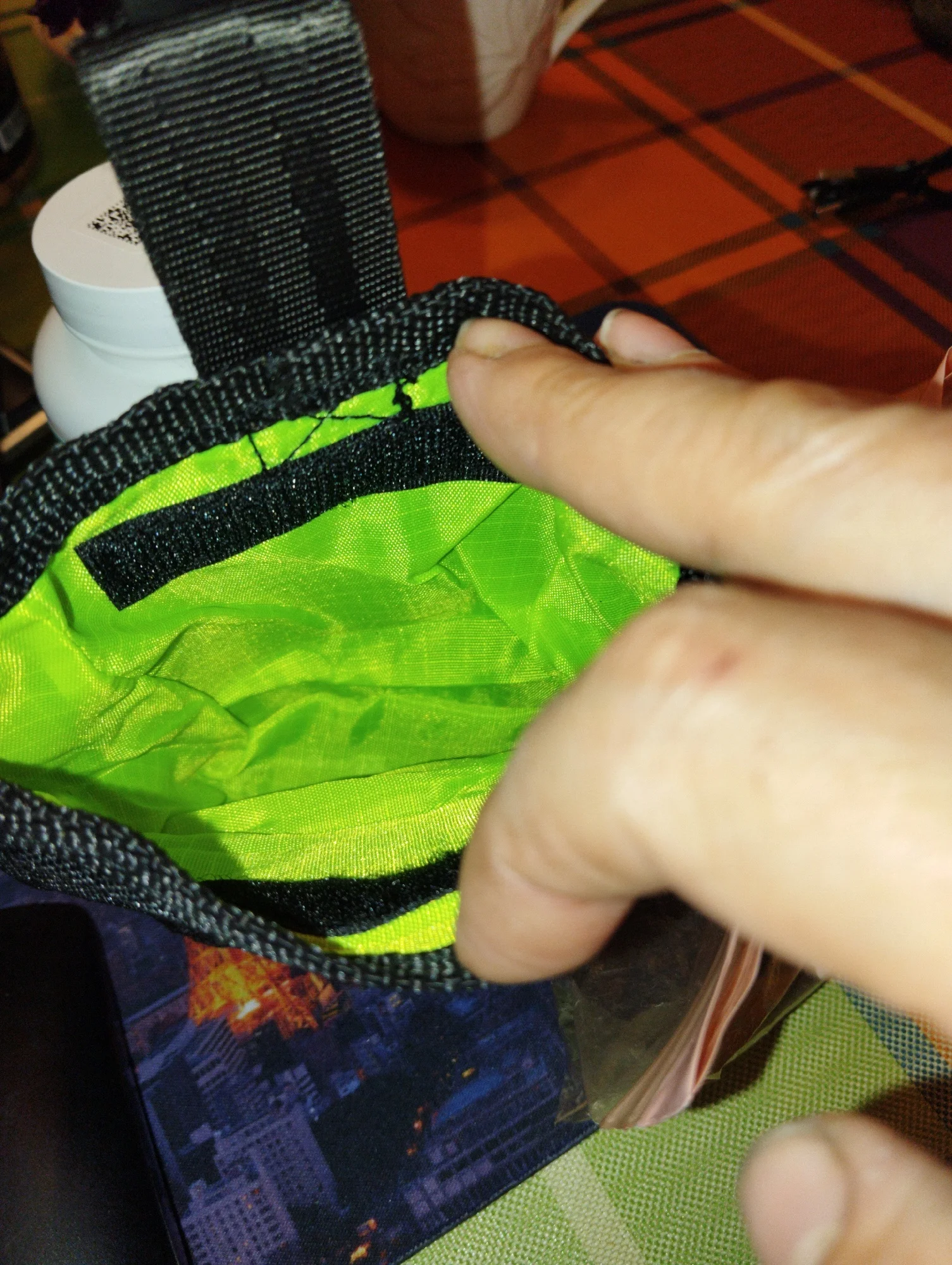 Spacious handbag for dog treats. We have a puppy, a shepherd breed, that needs training - we take treats outside. I liked this version of the handbag. My daughter got herself a smaller round bag with a zipper; it's not really my style. This handbag allows for quick retrieval of items through the open top, strong adhesive, loop for strap, hook for attaching to a belt, can be hooked onto a pocket or clothing hem.